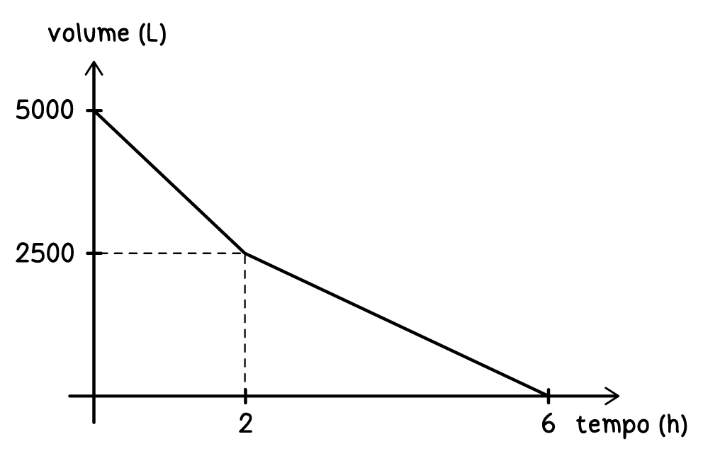 Uma caixa d’água de 5 000 L foi esvaziada em um período de 6h. Nas primeiras horas foram utilizadas duas bombas, mas depois de 2 horas uma delas teve um problema elétrico e parou de funcionar. O gráfico, formado por dois segmentos de reta, mostra o volume de água presente na caixa d’água, em função do tempo.