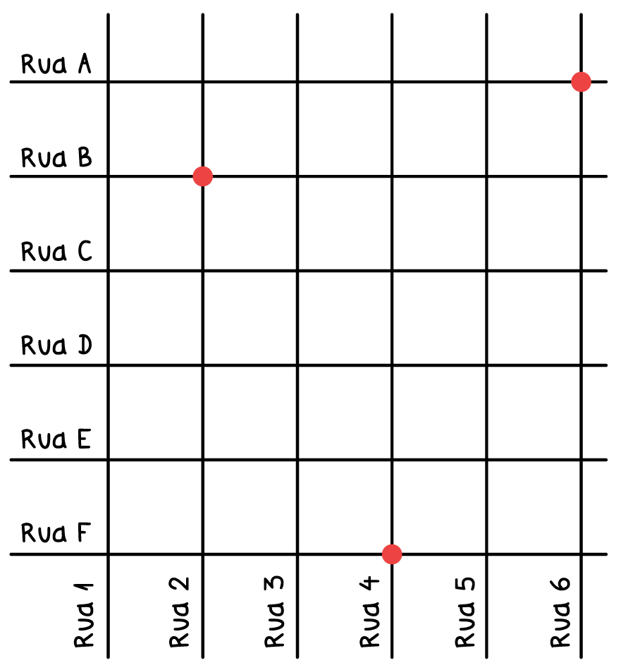 Os três pontos vermelhos marcam o trabalho de João, o de Maria e a Universidade em que irão estudar. Antônia ainda não trabalha. Todos desejam andar no máximo 2 quadras para chegar à Universidade. Sabendo que a Universidade fica na rua 4, qual é a opção mais próxima dos dois pontos que representam os locais de trabalho de João e Maria?